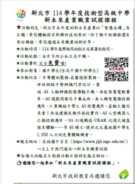 四、各場次辦理日期均為114學年度學期間之假日或寒暑假期間,活動全程免費,有意願參加的國中學生(含完全中學國中部學生),請依各場次報名日期逕上本課程網頁報名,報名網站:佳林國中校網首頁(https://www.jljh.ntpc.edu.tw/)→左上方熱門連結→新未來職業試探。