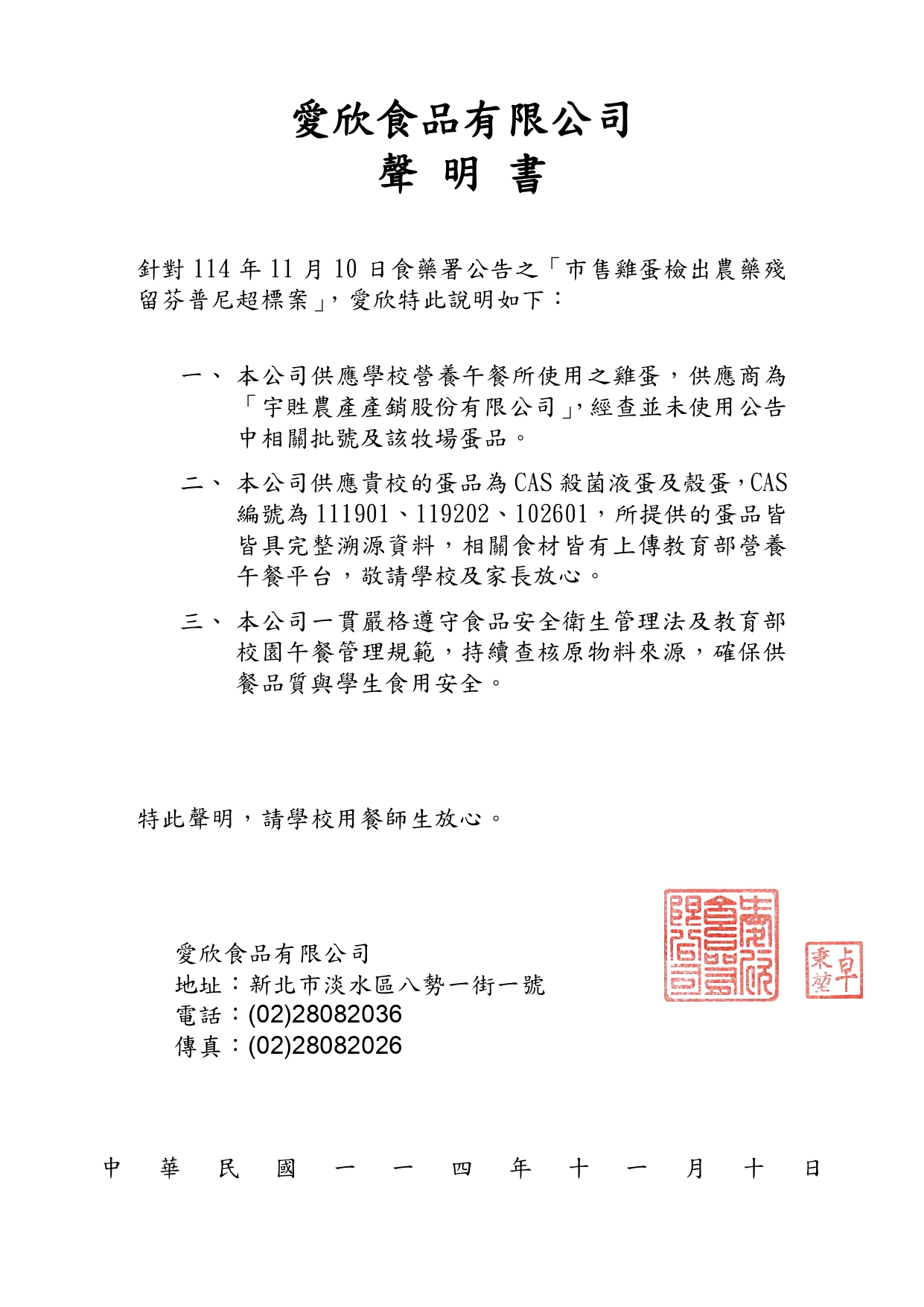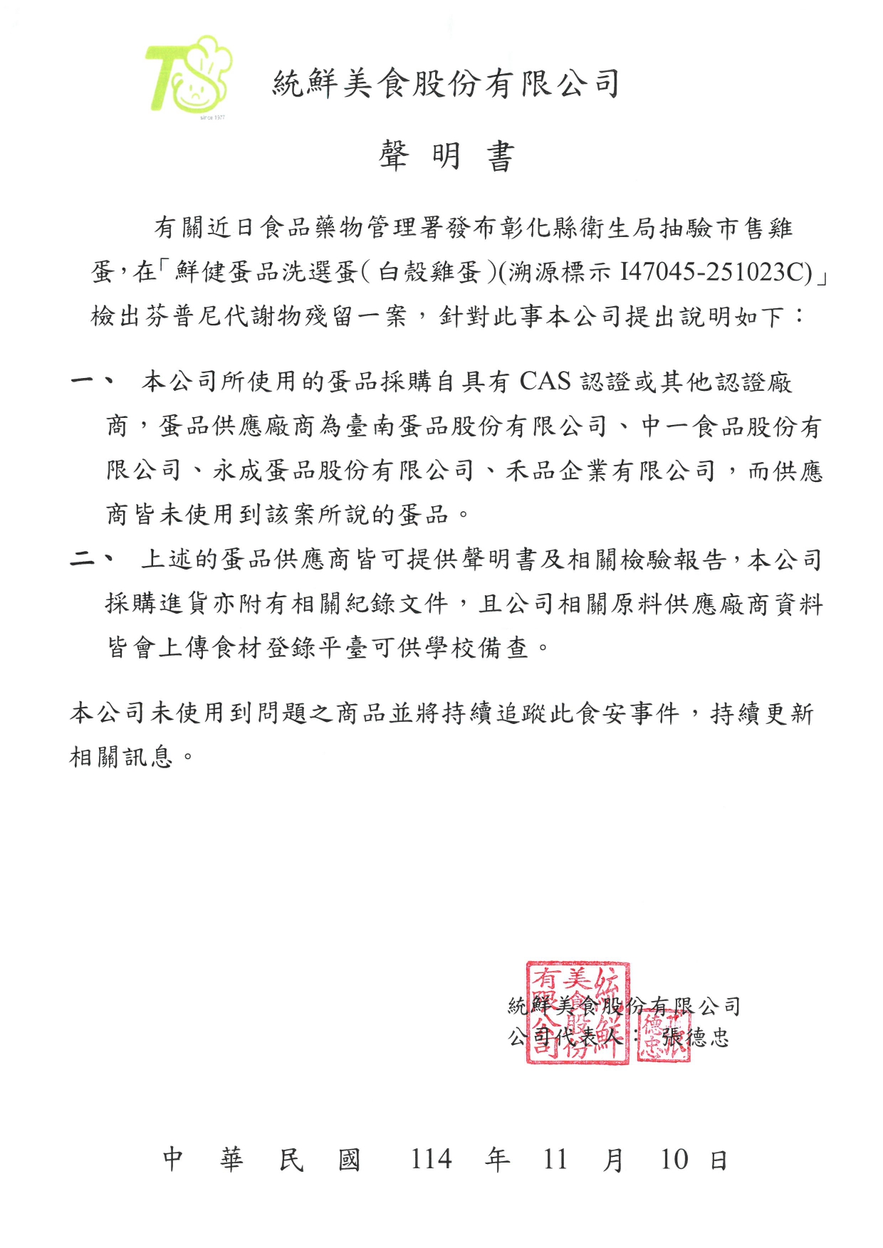 針對 114 年 11 月 10 日食藥署公告之「市售雞蛋檢出農藥殘留芬普尼超標案」團膳廠商及供應商聲明書