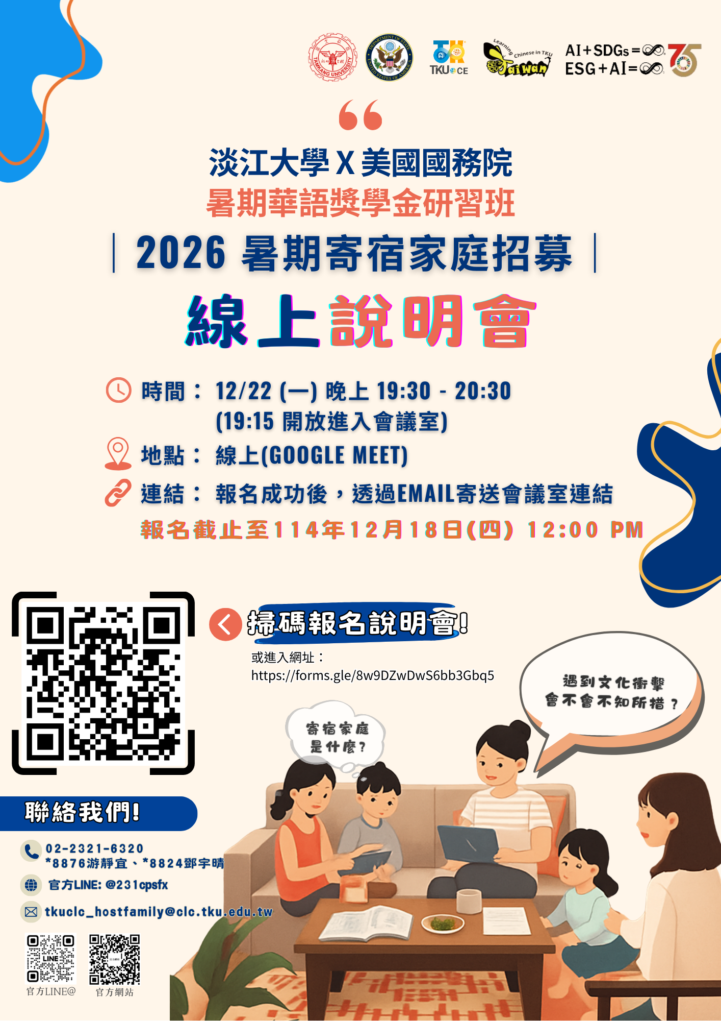 淡江大學華語中心與美國國務院合作辦理「2026暑期華語獎學金研習班」,擬於114年12月22日(星期一)舉辦「寄宿家庭招募-線上說明會」,詳情請參見活動海報。