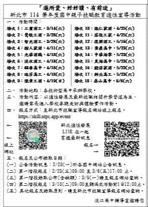 (一)請各國中協助轉知活動訊息予家長及學生(貼聯絡簿),並協助其至新北國中技優教育資訊平台-「選所愛、好好讀、有前途」技職宣導活動報名網站(https://skill.ntpc.app/event)線上報名。倘有資訊系統網站疑問,可洽智光商工資訊科王本堯主任,電話(02)29432491分機660;倘對各場次活動有任何疑問,可洽各承辦學校詢問。