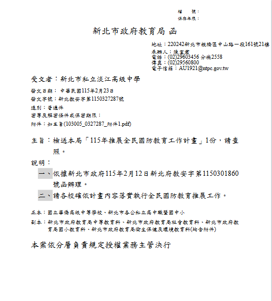 請各學制老師利用各種課程教學、集會與會議等時機加強宣導,強化全民防災避難知識,俾利推動全民國防教育宣導,並依「新北市全民國防手冊」納入本校課程發展委員會,配合課程融入教學運用,提升學生全民防衛知識;並置重點於國防部「新版臺灣全民安全指引手冊《當危機來臨時:臺灣全民安全指引》」,另配合本校學年度防災演練期程實施演練。