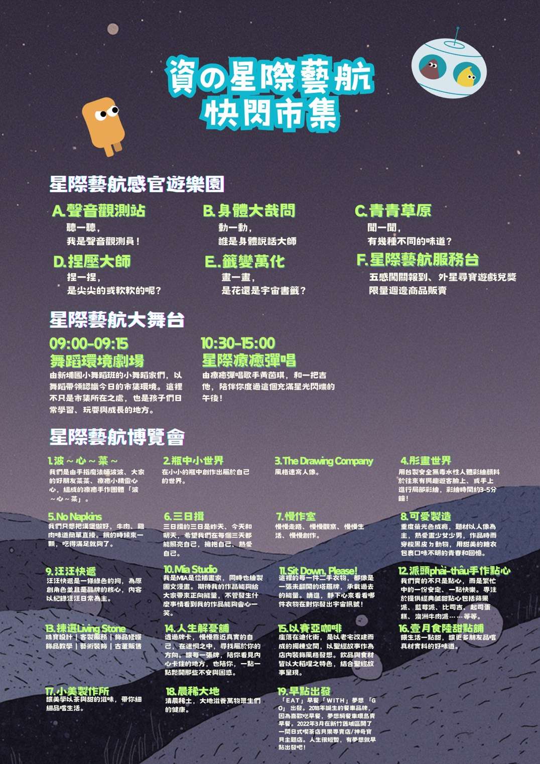 一、旨揭活動結合音樂、舞蹈欣賞與互動感受,融入創意市集元素,提供寓教於樂之參與機會,並透過多元感官體驗,豐富學生藝術涵養、拓展學習視野。活動相關訊息如下: