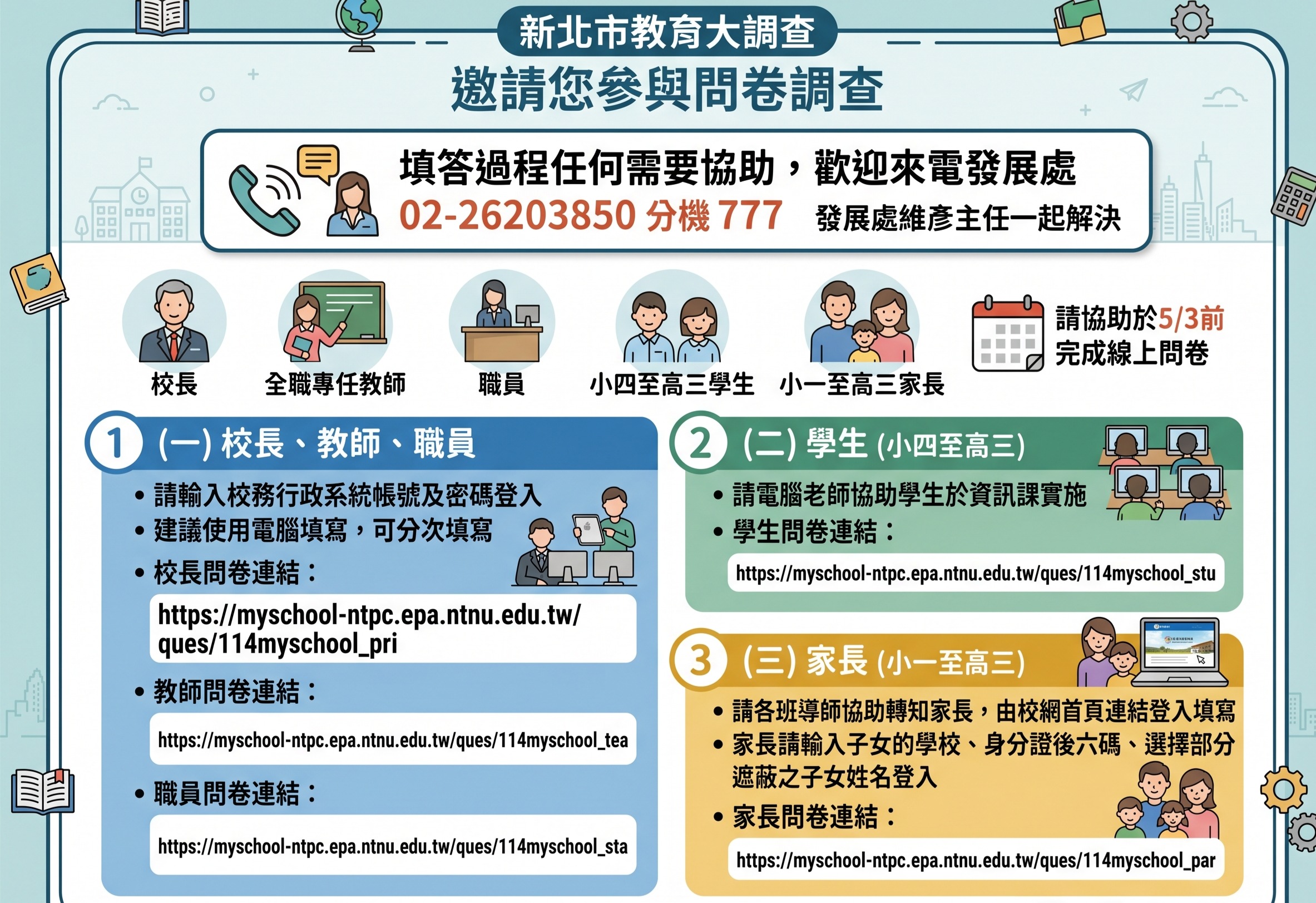 教師問卷連結:https://myschool-ntpc.epa.ntnu.edu.tw/ques/114myschool_tea