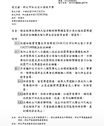 有鑑於近日校外人潮聚集之公共場域隨機襲(攻)擊事件,請學校運用各式集會或課程融入時機,強化師生安全教育宣導