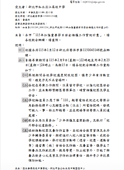 為強化寒假期間學生校外活動安全維護,有效掌握學生安全狀況,俾利校安事件即時通報與處理,請本校各學制相關主管及承辦人員保持通訊(行動電話)之暢通。